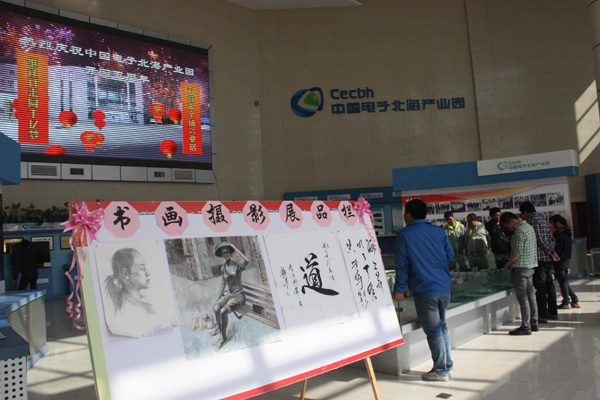 系列活動以當月初征集書畫、攝影作品拉開序幕,通過海報、網站、微信等多種平臺號召園區(qū)全體職工與社會關注園區(qū)發(fā)展的熱心人士參與首屆中國電子北海產業(yè)園書畫、攝影創(chuàng)作比賽,截止開園5周年前夕,共收到各類作品40余幅。經過籌備小組、評委、藝術老師的認真篩選、對比,評選出了一二三等獎及優(yōu)秀獎若干名,獲獎作品不僅個性鮮明、創(chuàng)意新穎、富有時代美感,而且體現了電子信息行業(yè)鮮明的特色。獲獎作品與以反映園區(qū)建設歷程、科技成果、領導關懷為主題的圖板一同于12月30日在園區(qū)向全體職工展出。