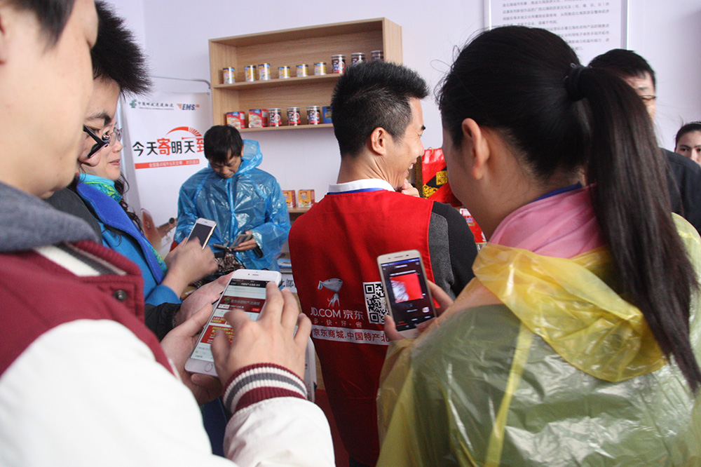 電商谷展區(qū)熱鬧非凡(與會嘉賓在電商谷體驗京東北海館購物)