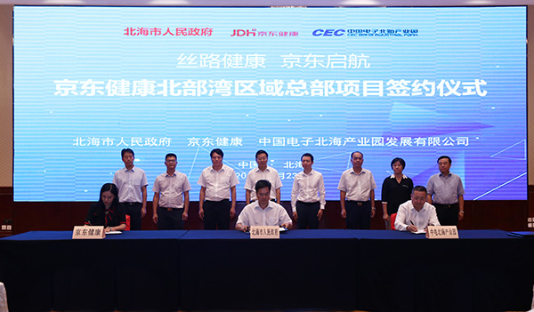 2019年9月23日,京東健康北部灣區(qū)域總部項(xiàng)目簽約儀式在北海香格里拉大酒店舉行。市長(zhǎng)蔡錦軍,京東集團(tuán)副總裁、京東健康首席執(zhí)行官辛利軍,中電北海產(chǎn)業(yè)園發(fā)展有限公司執(zhí)行董事徐俊男等見(jiàn)證簽約儀式。